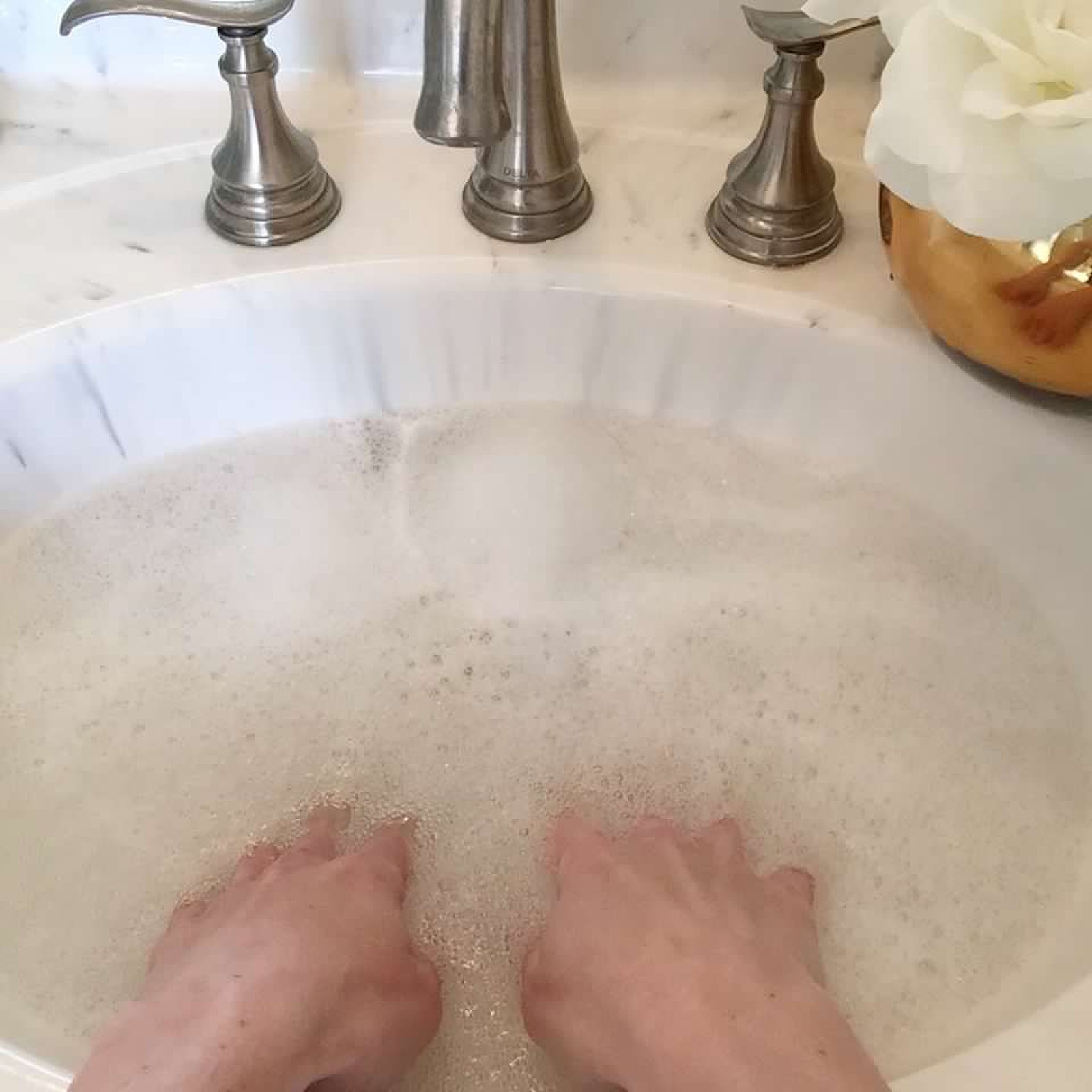 This is a two-part step. The cuticle oil softens your cuticles, allowing you to remove them easily. Soaking them helps soften the skin. Apply the cuticle oil and soak both hands at the same time for about 3-5 minutes in warm water.